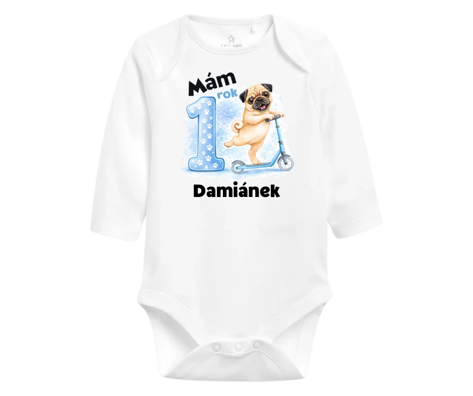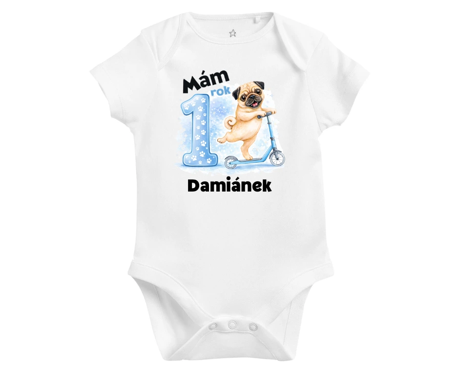 První narozeniny mohou být i trochu rozverné. Stylové body s roztomilým mopsem na koloběžce, doplněné o výraznou číslici 1 a jméno oslavence, zaujme na první pohled a pobaví celou rodinu. Originální kousek na oslavu, focení i jako vzpomínka.
