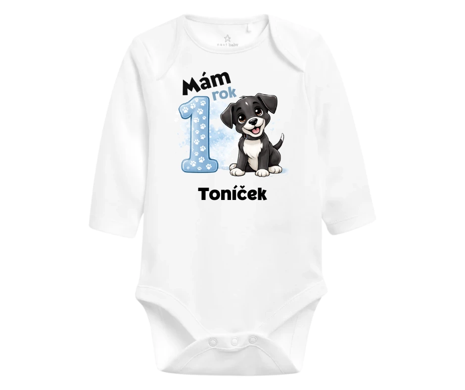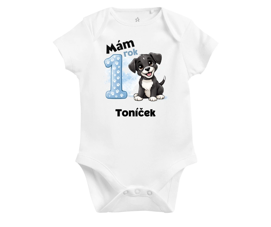 Roztomilé body s veselým pejskem je jako stvořené pro malého oslavence! Originální potisk s číslem 1, nápisem „Mám 1 rok“ a jménem dítěte z něj dělá krásnou vzpomínku na první narozeniny. Ať už ho využijete na focení, oslavu nebo jen tak na běžné nošení, vždycky vykouzlí úsměv.