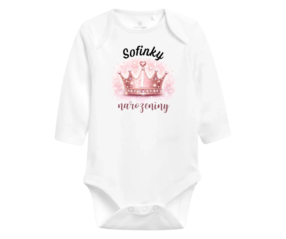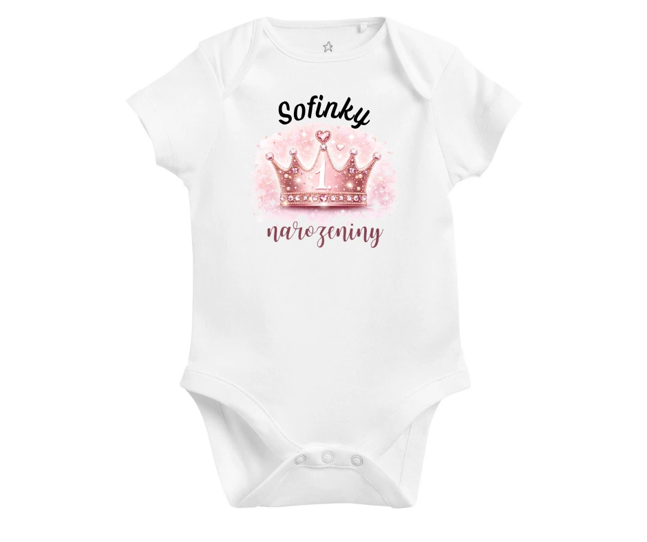 Stylové body pro oslavu 1. narozenin s motivem korunky a jménem podle vašeho přání.