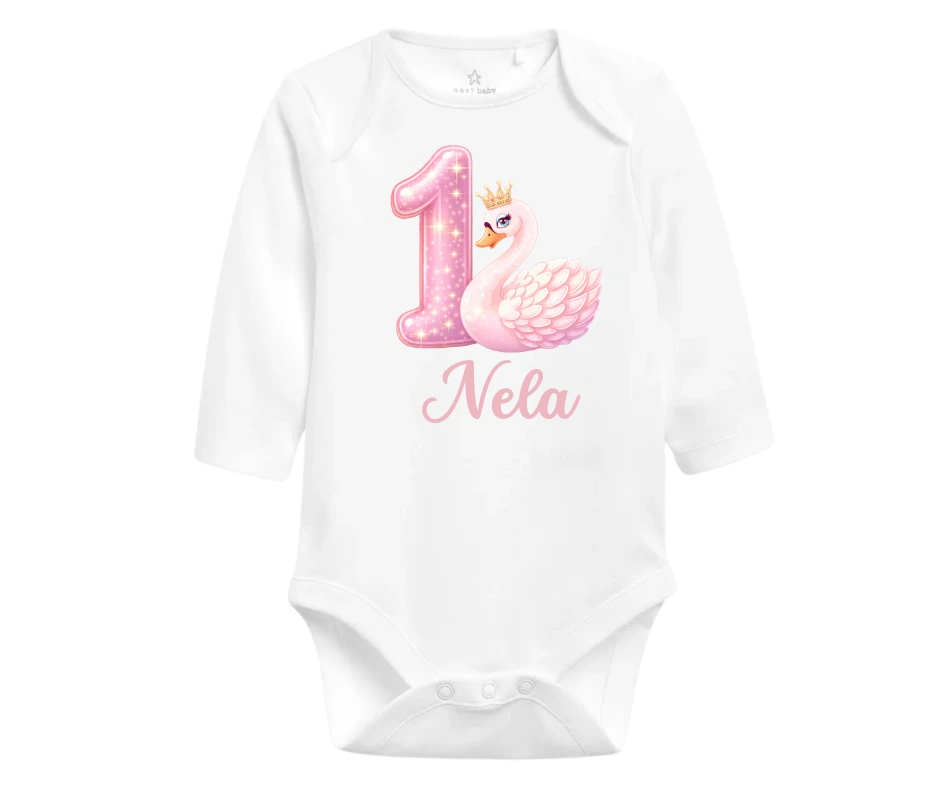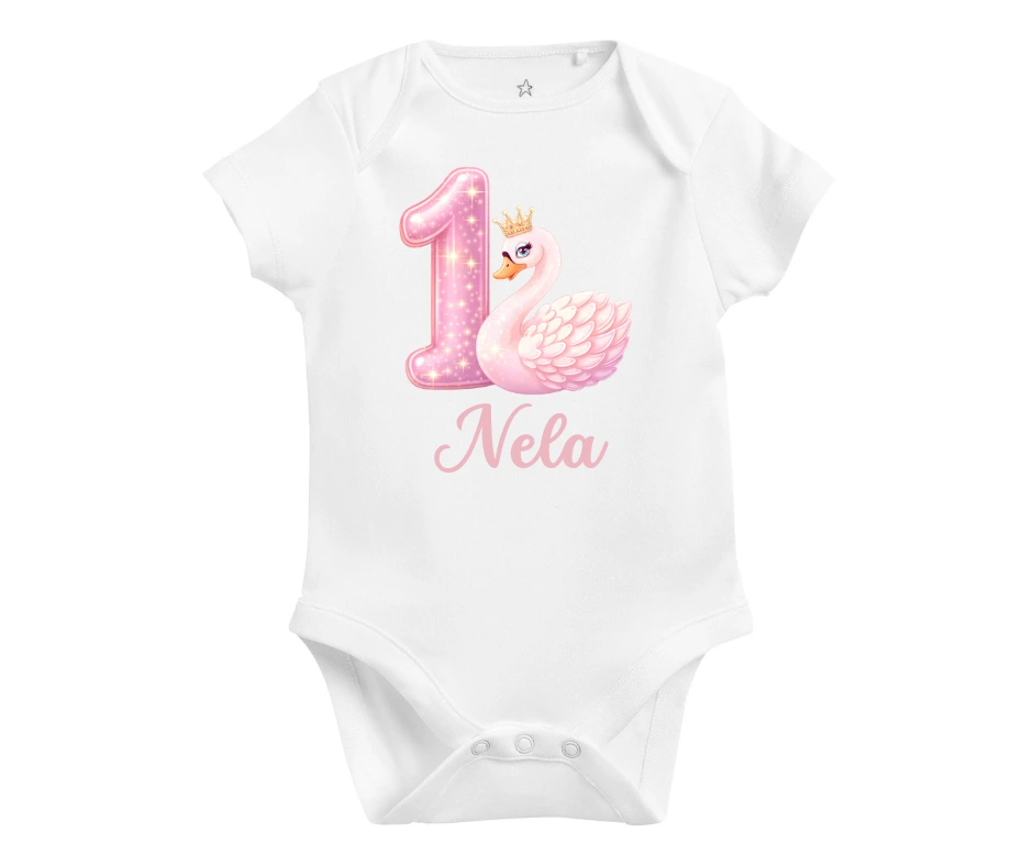 Elegantní narozeninové body s růžovou labutí, královskou korunkou a jemnou jedničkou je jako stvořené pro malou princeznu, která slaví svůj první rok. Jméno na přání dodá tomuto kousku osobní kouzlo – ať už na focení, dortíkovou oslavu nebo jako památku.