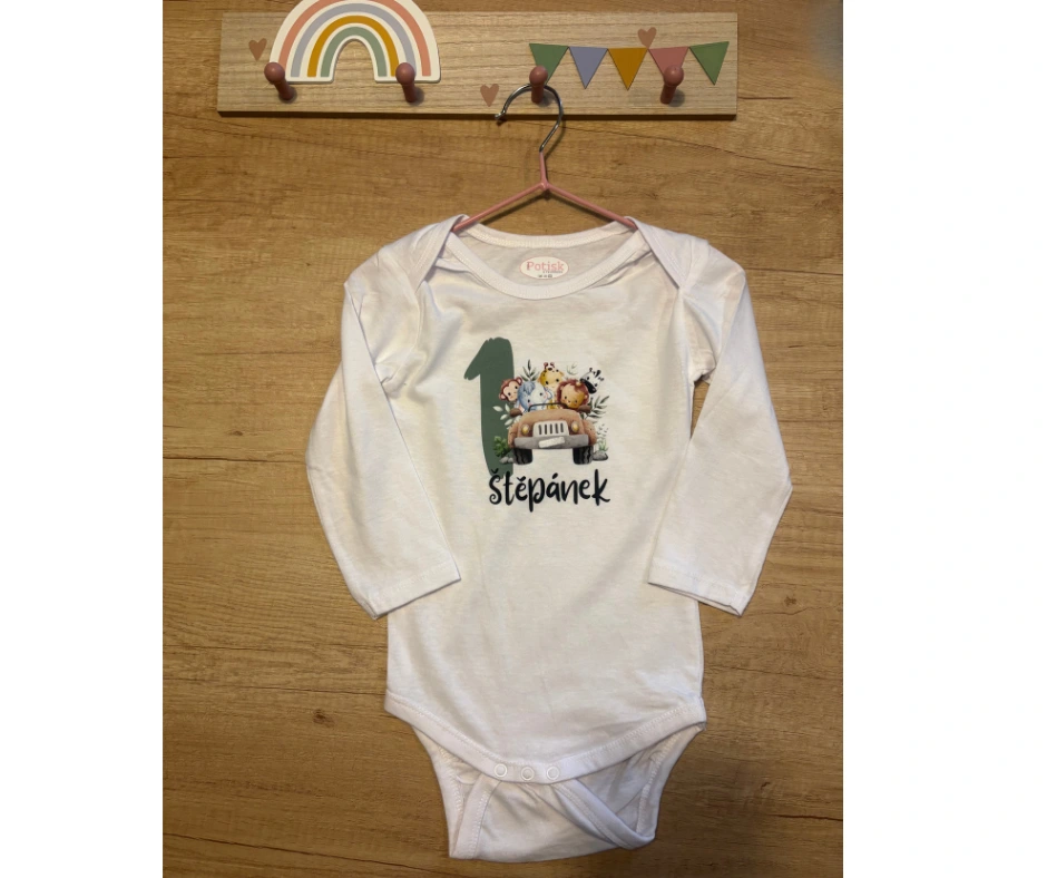 Roztomilé narozeninové body s motivem safari zvířátek v autě a velkou zelenou jedničkou je ideální volbou na oslavu prvních narozenin malého dobrodruha. Originální design doplním o jméno vašeho chlapečka, a vznikne tak krásná památka na první velký den.