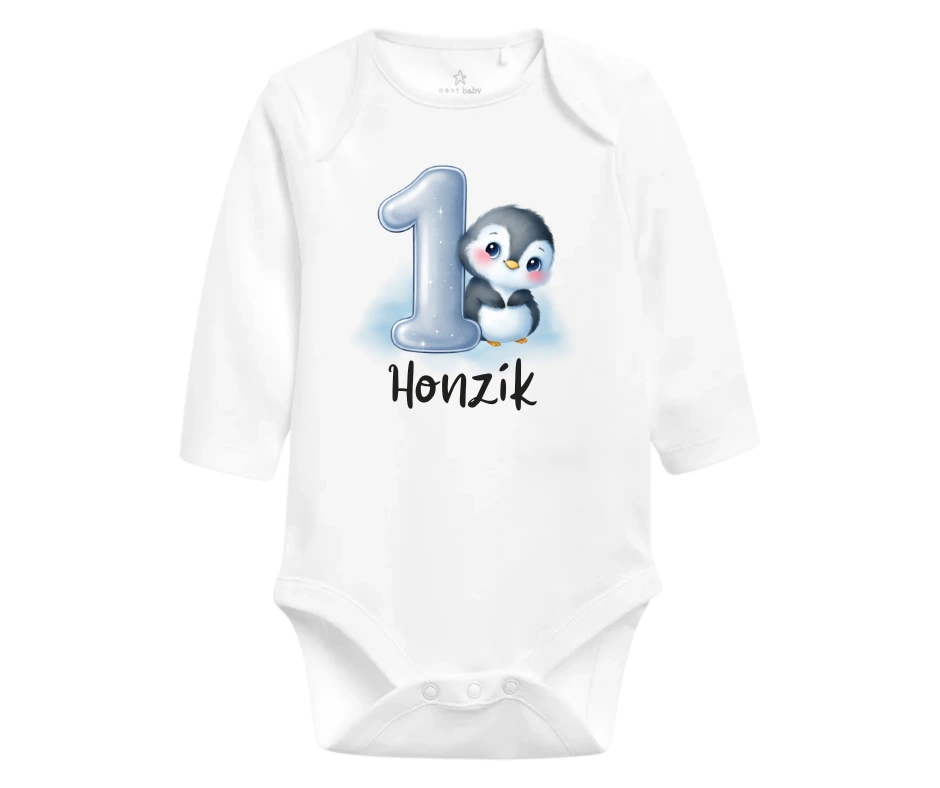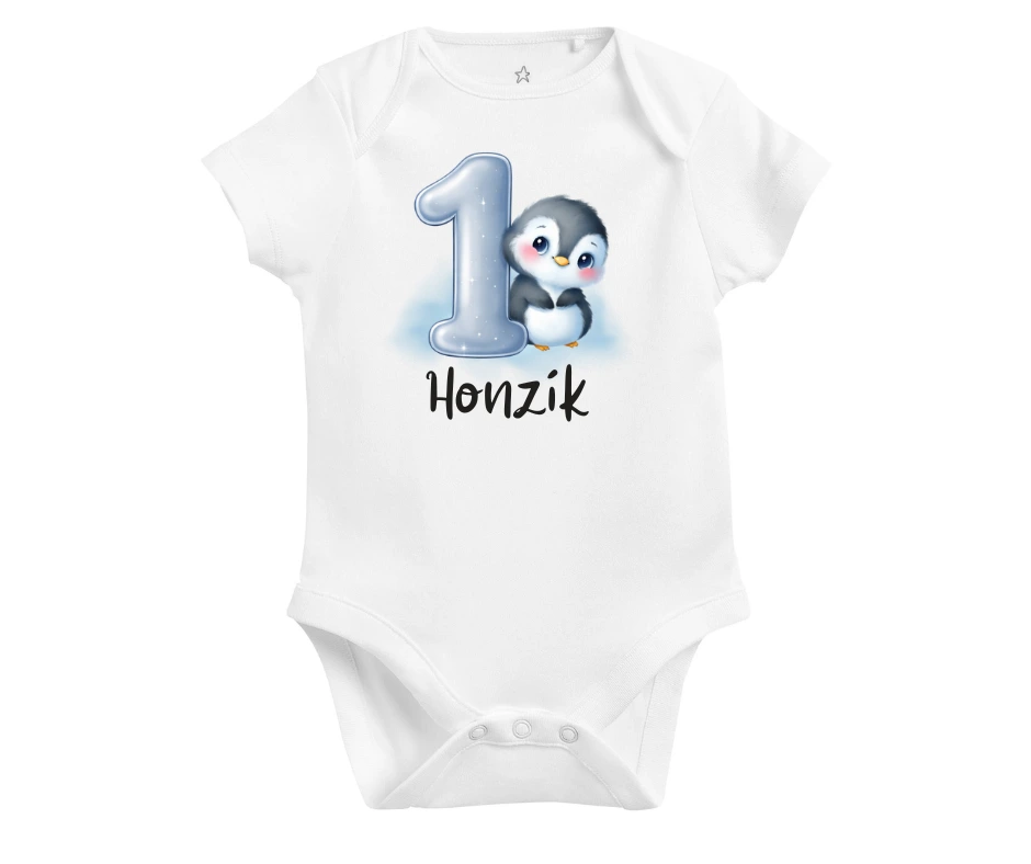 Něžné narozeninové body s roztomilým tučňáčkem a výraznou jedničkou v elegantní šedé barvě. Skvěle se hodí na první oslavu, focení i jako památka. Jméno doplním přesně podle tebe – díky tomu vznikne jedinečný kousek, který bude mít i vzpomínkovou hodnotu.