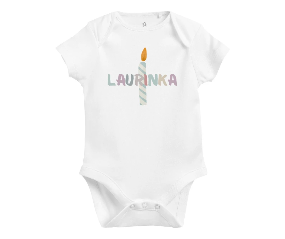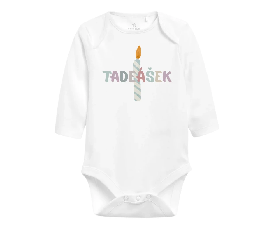 Originální potisk se jménem dítěte a roztomilou pastelovou svíčkou vytváří z obyčejného bodyčka krásnou památku na první velký den.