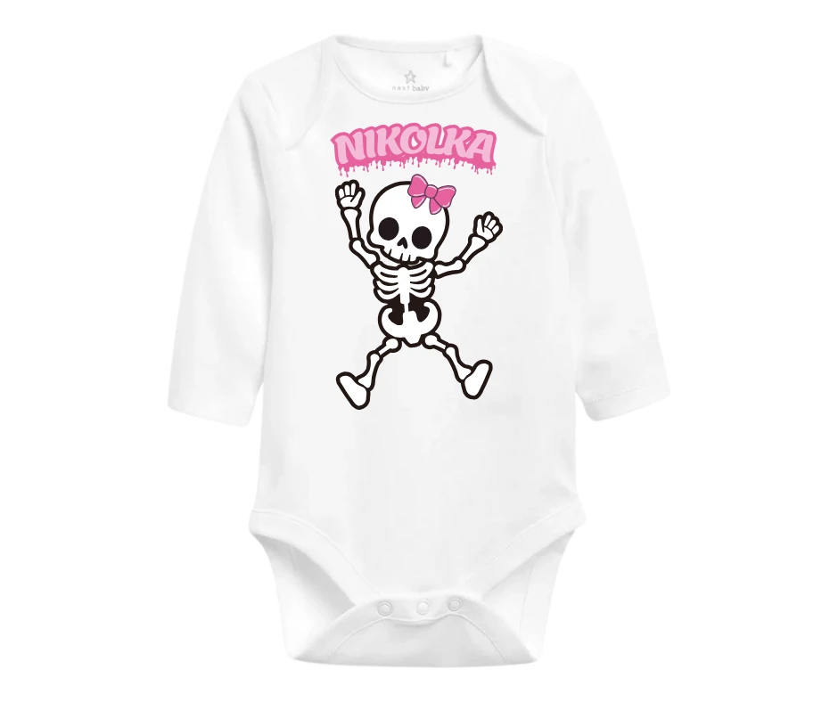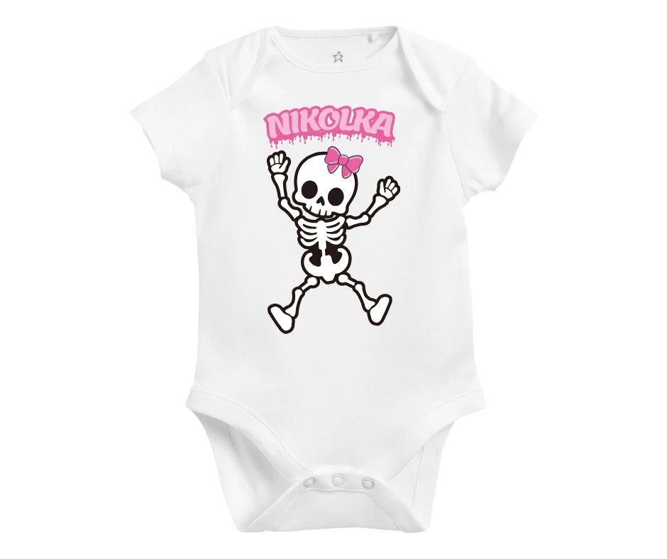Veselý kostlivec s růžovou mašličkou a možností doplnit vlastní jméno dítěte dělá z bodyčka jedinečný a osobní dárek.