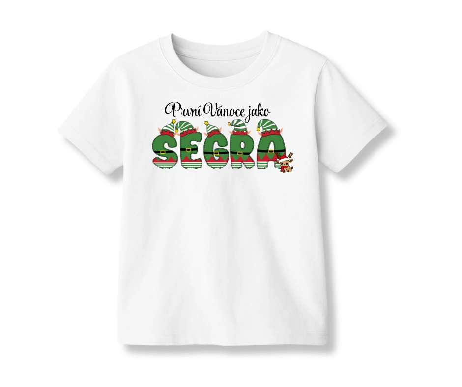 Roztomilé dětské tričko pro malou princeznu která letos slaví První Vánoce jako Ségra. Veselé vánoční barvy, jemný elfí motiv a pohodlný střih dělají z trička krásnou součást rodinné vánoční sady.