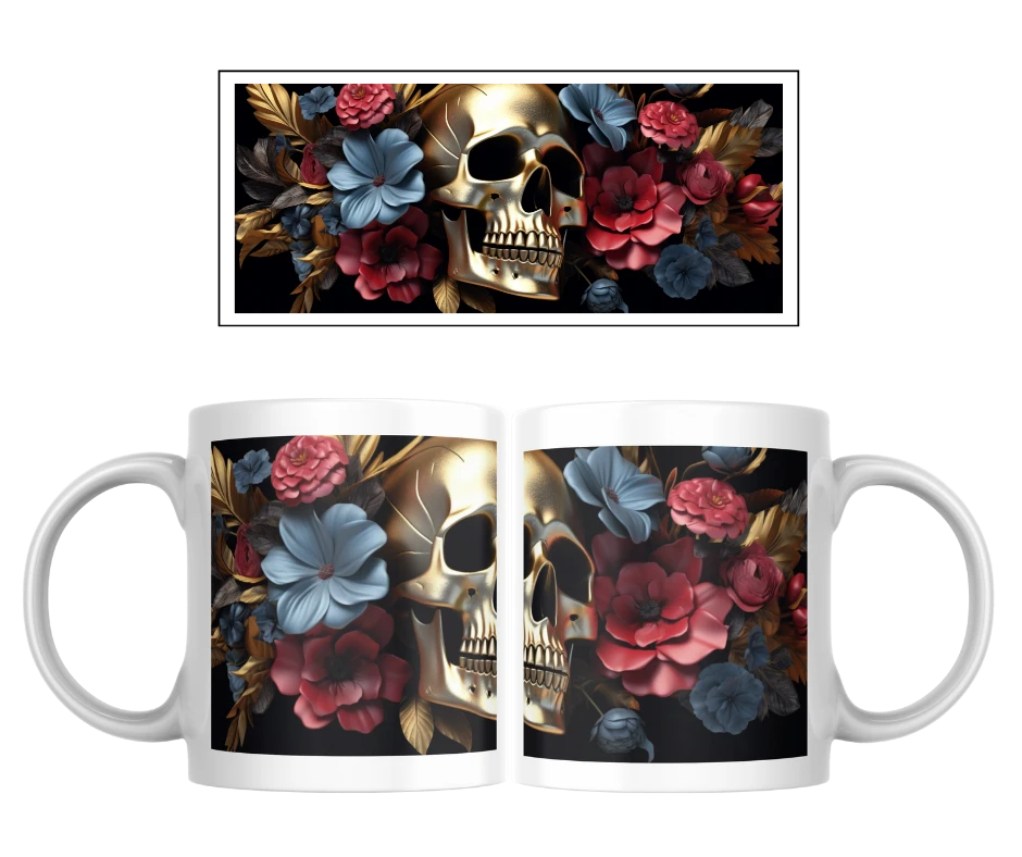 Spojení temnoty a elegance v jednom. Na hrnku září zlatá lebka obklopená sytými květy v červených, modrých a černých odstínech. Výsledek působí tajemně, ale přitom luxusně – ideální pro ty, kteří chtějí Halloween pojmout stylově.