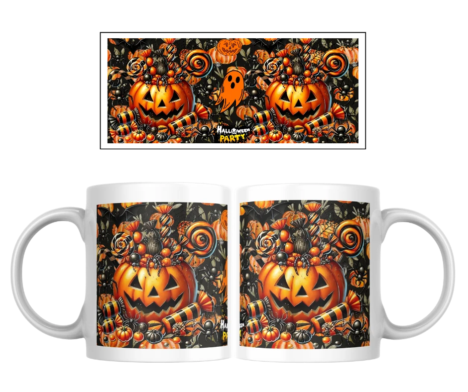 Tenhle hrnek je jako stvořený pro všechny, kdo berou Halloween i jako svátek sladkostí. Uprostřed září velká vyřezávaná dýně, obklopená barevnými lízátky, karamelkami a drobnými dýňkami. V kontrastu s černým pozadím působí motiv výrazně, veselě a přitom lehce strašidelně.