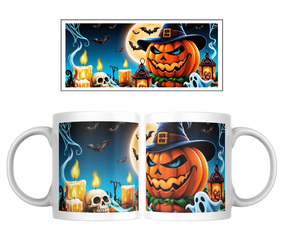Tenhle hrnek v sobě má všechno, co k Halloweenu patří – zlověstná dýně s kloboukem, hořící svíce, lebka, duchové i netopýři pod úplňkem. Každý detail vytváří magickou atmosféru, která vás vtáhne do kouzelné noci.