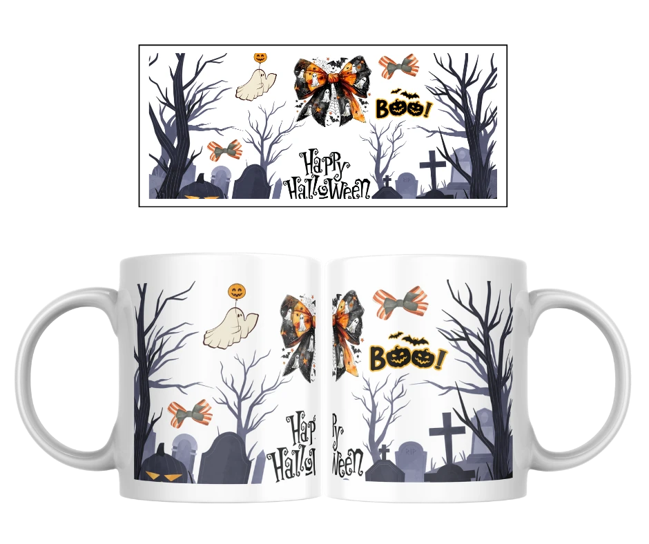Jednoduchý, ale přesto nápaditý motiv, který na první pohled zaujme. Bílý podklad zdobí siluety stromů a hrobů, mezi nimiž se objevuje roztomilý duch, pestrobarevné mašle a hravý nápis „Boo!“. Nechybí ani ozdobné písmo „Happy Halloween“, které celý motiv hezky propojuje.