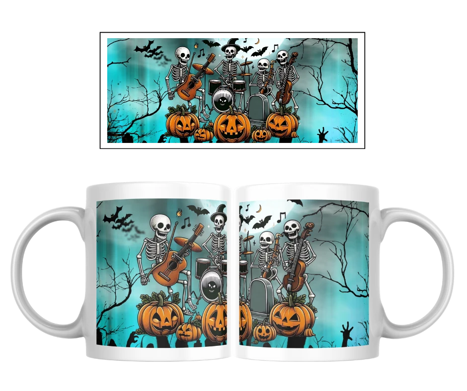 Na tomhle hrnku se Halloween mění v pořádný koncert! Parta kostlivců hraje na kytaru, housle i bicí, zatímco pod nimi svítí vyřezávané dýně a nad hlavami poletují netopýři. Pozadí v odstínech tyrkysové dodává celé scéně jedinečný, až komiksový nádech.