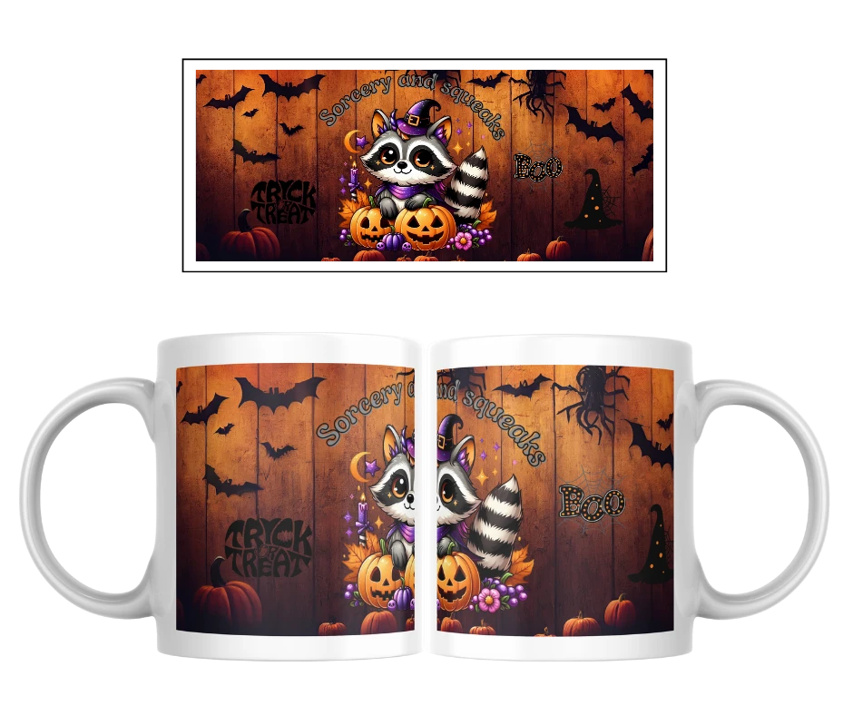 Pokud máte rádi spíš roztomilé než strašidelné motivy, tenhle hrnek vás nadchne. Uprostřed sedí mýval v čarodějnickém klobouku, obklopený dýněmi, květinami a drobnými dekoracemi. V pozadí se objevují netopýři a pavoučí sítě na dřevěném podkladu, což vytváří hřejivou, podzimní atmosféru.