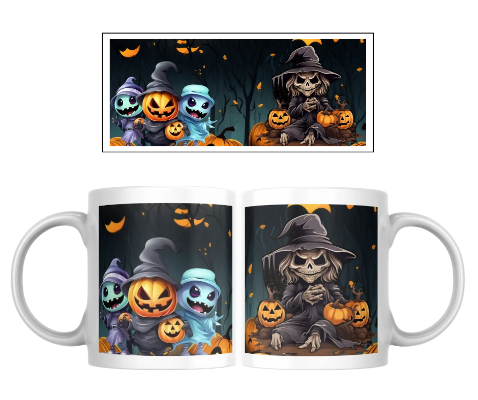 Originální hrnek, který spojuje dvě tváře Halloweenu. Na jedné straně vás rozesmějí usměvaví duchové s dýní, na druhé už čeká temná čarodějka se svou sbírkou vyřezávaných dýní.