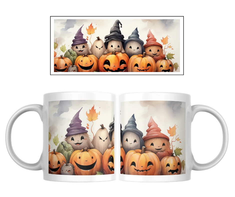 Hrnek s motivem, který ukazuje, že Halloween nemusí být jen děsivý. Usměvavé dýně a malí skřítci v barevných čepičkách působí hravě a přátelsky.