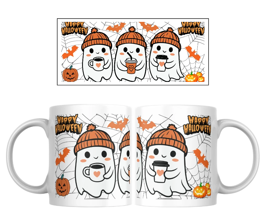 Pokud hledáte hrnek, který je spíš kouzelný než strašidelný, tenhle motiv vás nadchne. Duchové v čepicích s bambulkou drží horké nápoje a vytváří tak dokonalou podzimní pohodu. Okolo nich se vznášejí netopýři a pavučiny, nechybí ani drobné dýně a nápis Happy Halloween.