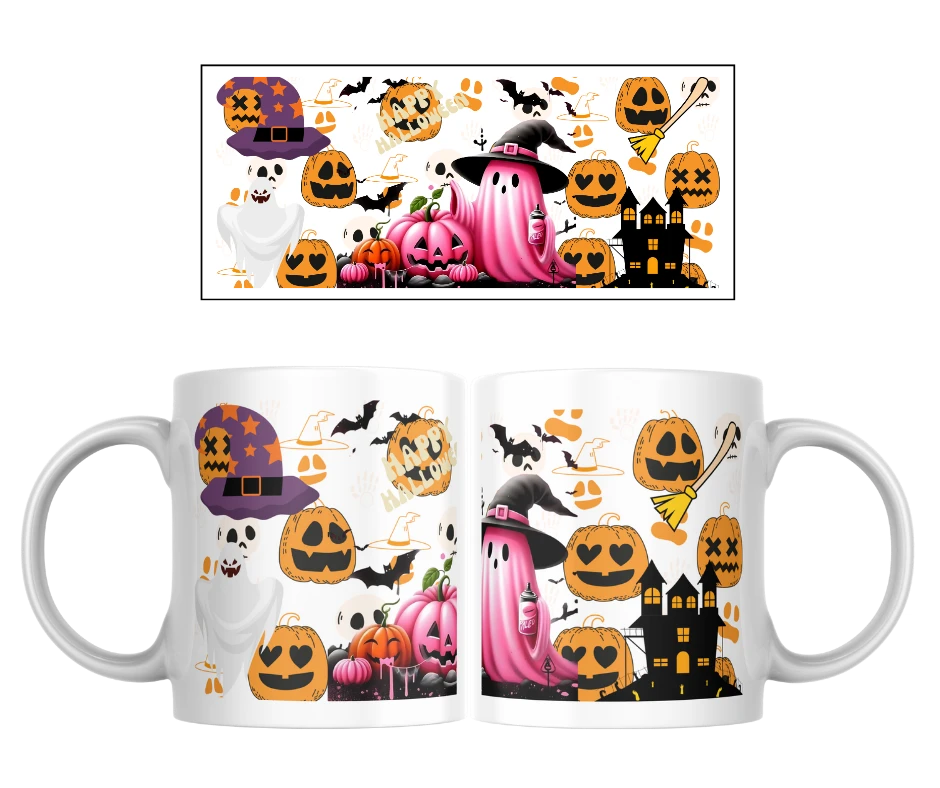 Na tomhle hrnku se potkává tradiční Halloween s moderním stylem. Hlavní roli hraje růžový duch v čarodějnickém klobouku, obklopený dýněmi se zábavnými obličeji, připomínajícími emotikony. Nechybí ani strašidelný hrad, koště a netopýři, které celému motivu dodávají správnou halloweenskou atmosféru.