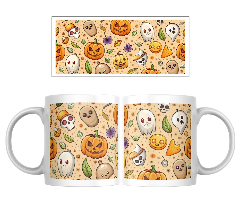 Roztomilí duchové, dýně s úsměvem, barevné listy i drobné halloweenské motivy – tenhle hrnek ti připomene, že Halloween nemusí být vůbec strašidelný.