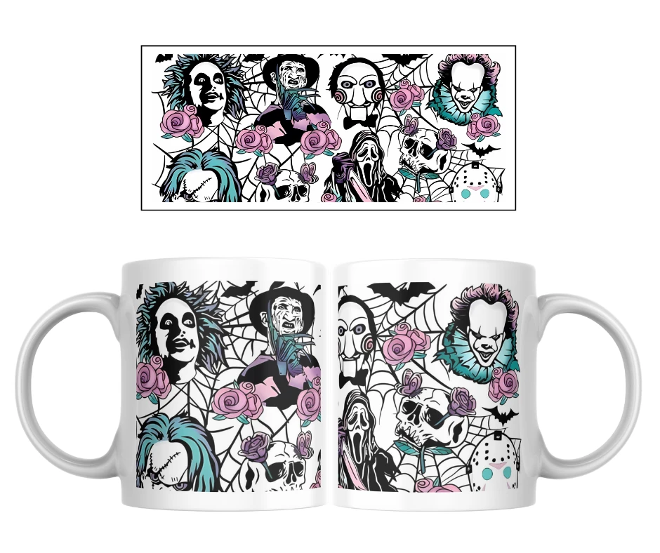 Tenhle hrnek je splněným snem každého milovníka hororů. Najdete na něm legendární postavy z kultovních filmů, které děsily celé generace – od klauna, přes masky až po ikonické strašidelné tváře.