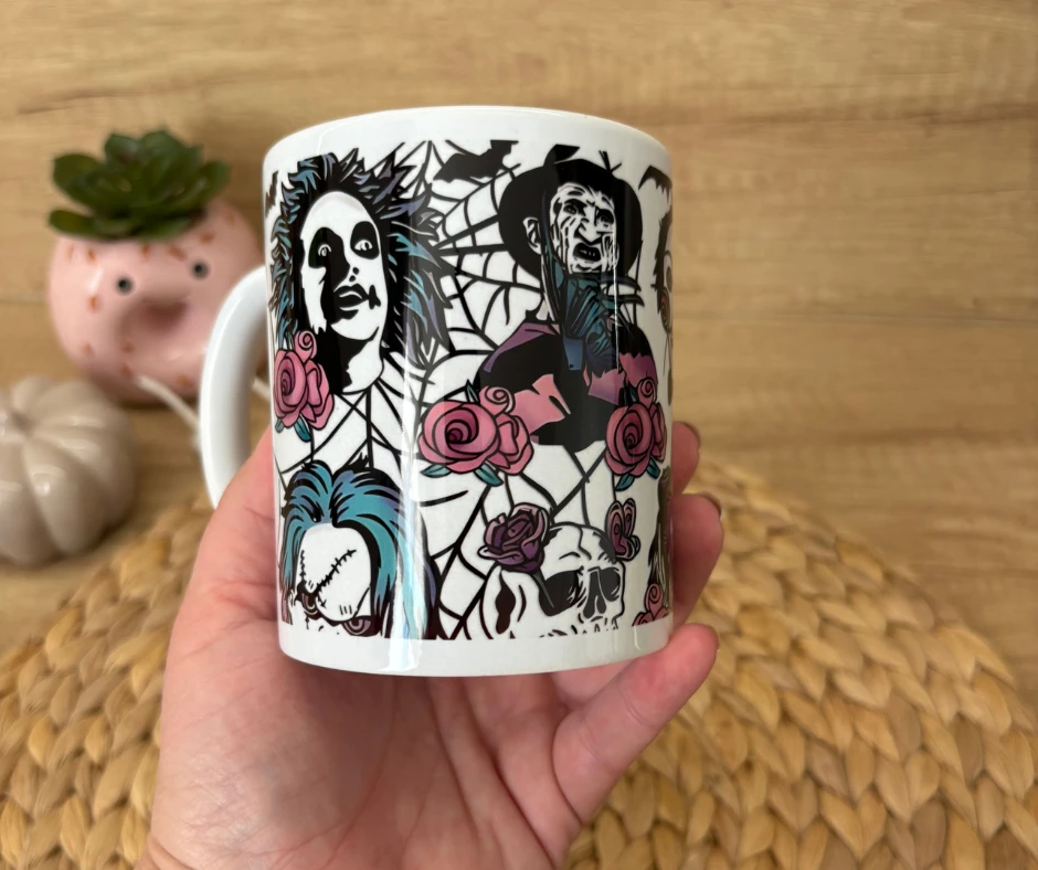 Motiv je netradičně doplněný o fialové růže a pavučiny, které dávají hrnku originální a zároveň lehce elegantní vzhled. Díky tomu se hodí nejen jako strašidelný doplněk na Halloween, ale i jako celoroční připomínka vaší lásky k hororům.