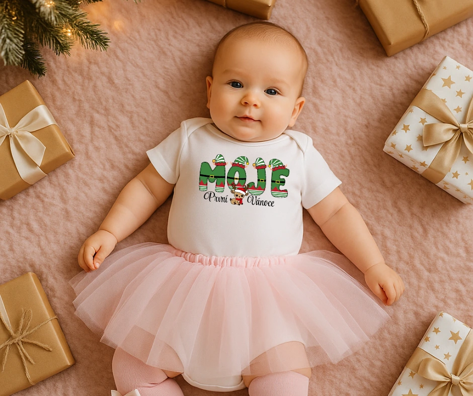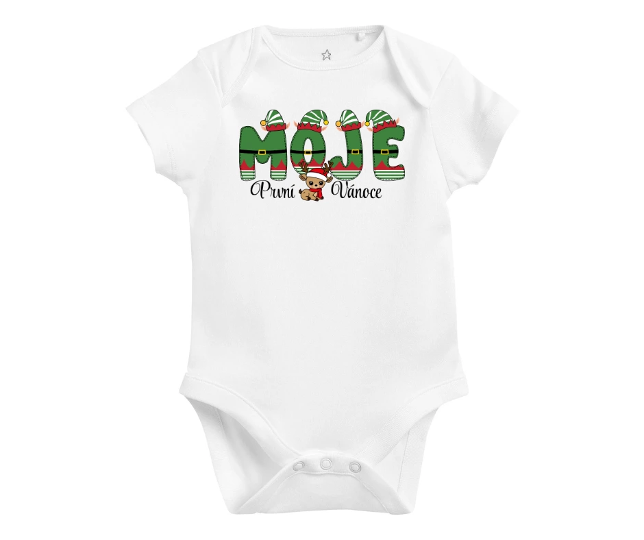 Měkoučké bílé body s nápisem Moje první Vánoce je dokonalé pro miminka která letos slaví své první svátky. Vánoční motiv je jemný, veselý a krásně vynikne na fotkách i na společném rodinném setu.