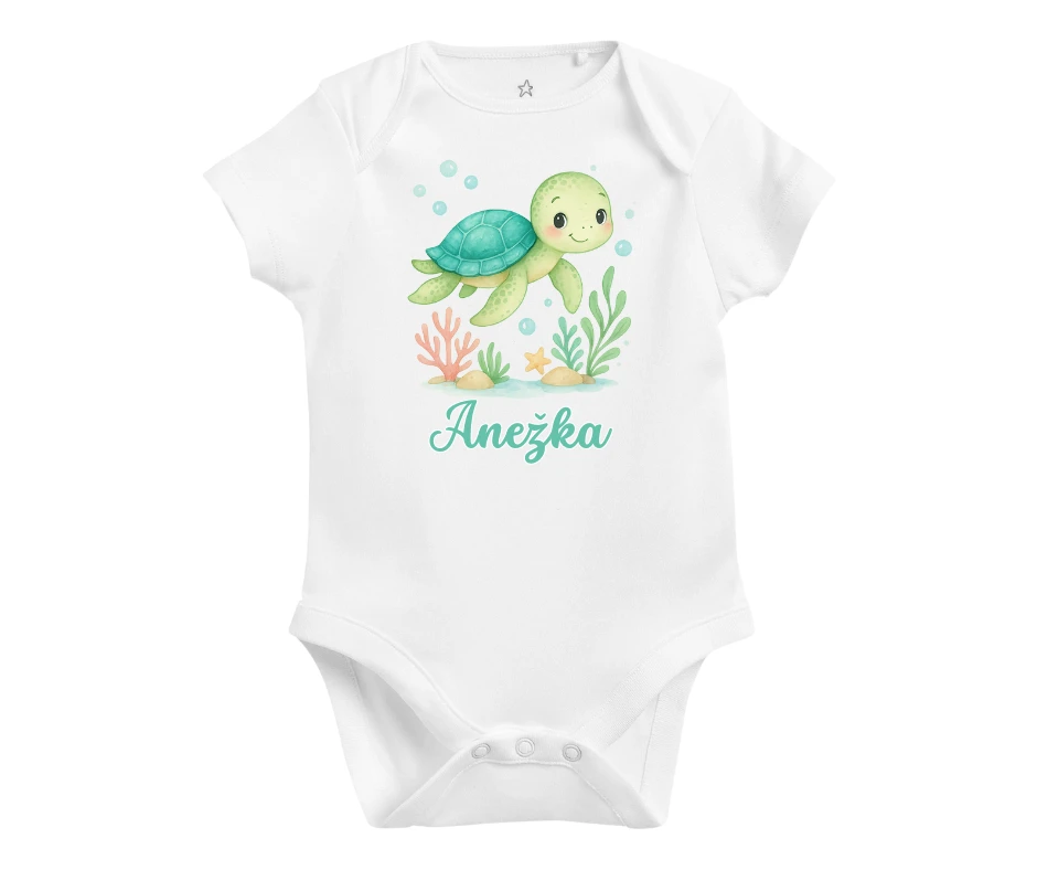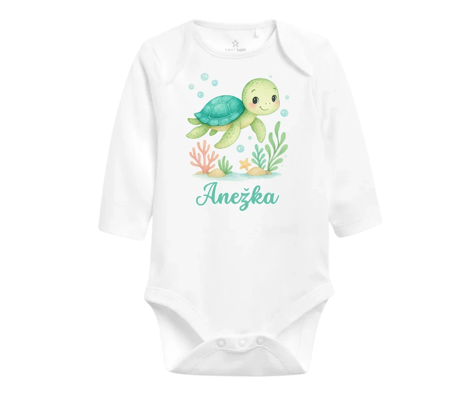 Usměvavá želvička plující mezi korály je krásným symbolem léta, radosti a mořských dobrodružství. Díky jménu přímo na body se z obyčejného kousku stává osobní a milý dárek, který potěší každou maminku i její děťátko.