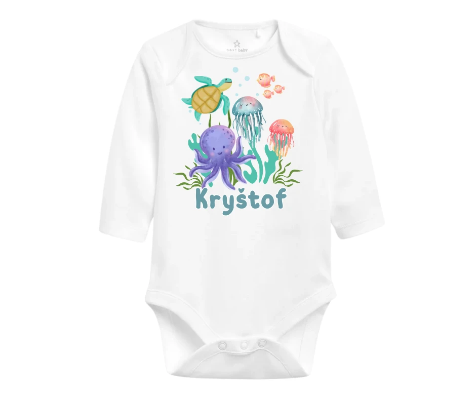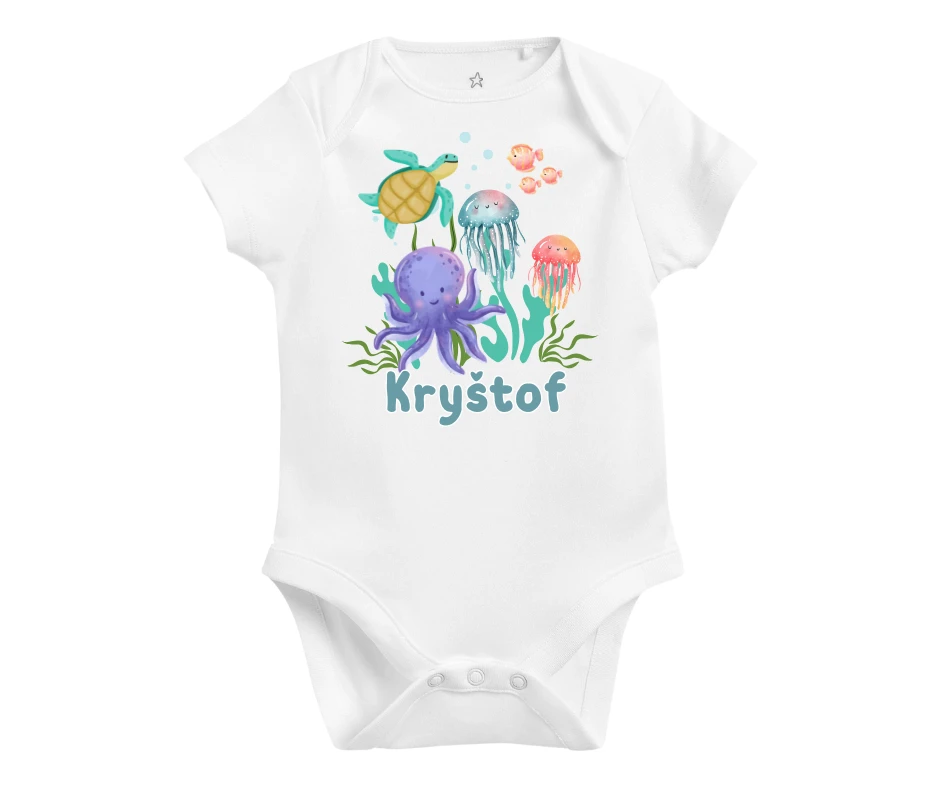 Barevný mořský svět plný medúzek, rybiček, želvičky a roztomilé chobotnice – to je motiv, který přináší letní dobrodružství přímo na dětské body. A co víc? Body zdobí i jméno vašeho chlapečka, takže vzniká hravý a osobní kousek, který potěší každou maminku.