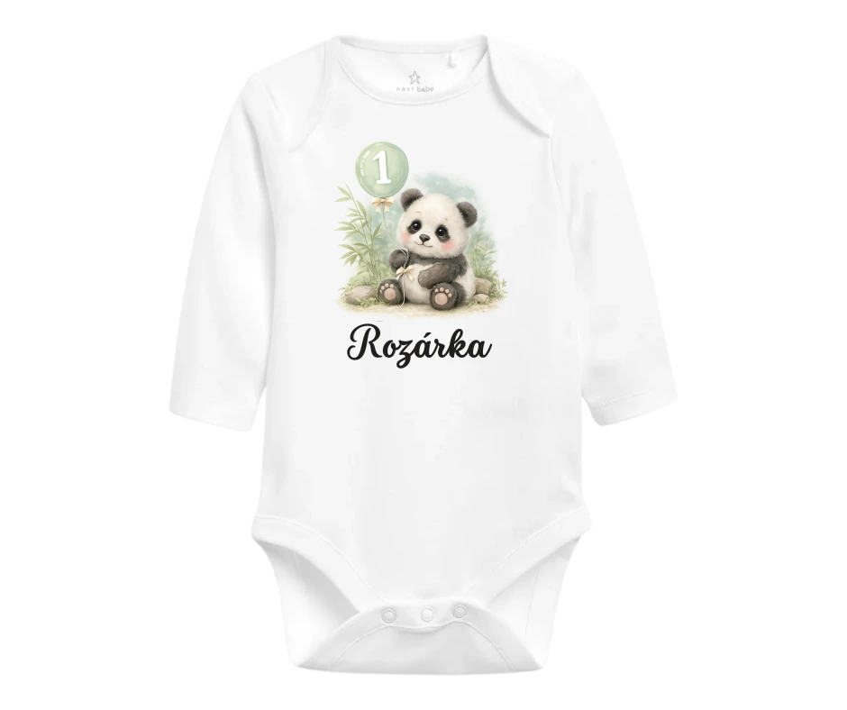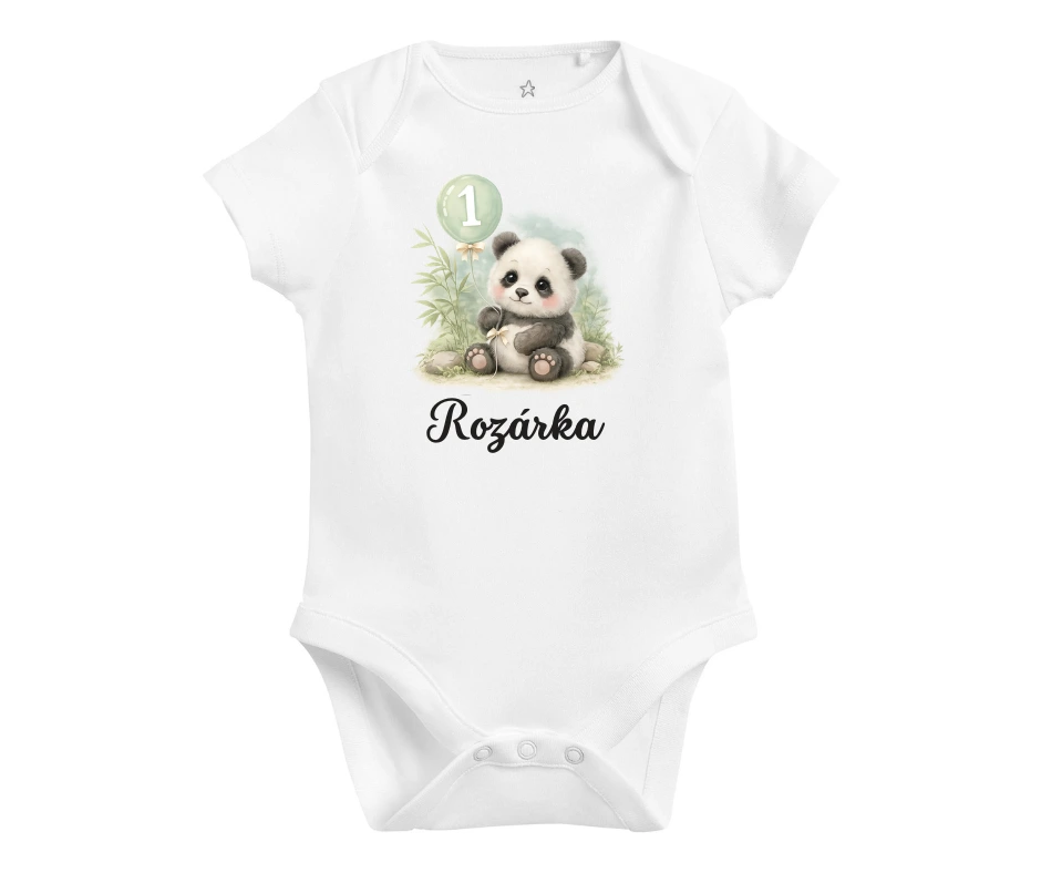 Toto bílé body s krátkým rukávem je skvělým dárkem k 1. narozeninám. Motiv pandy působí jemně a hravě, číslice “1” jasně ukáže, že se slaví první rok. Body lze doplnit o jméno dítěte, takže vznikne originální a osobní kousek, který zůstane krásnou vzpomínkou.