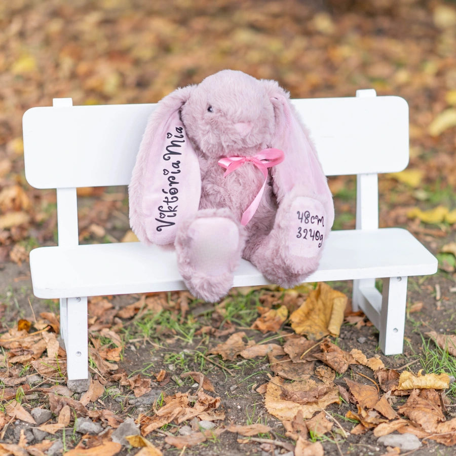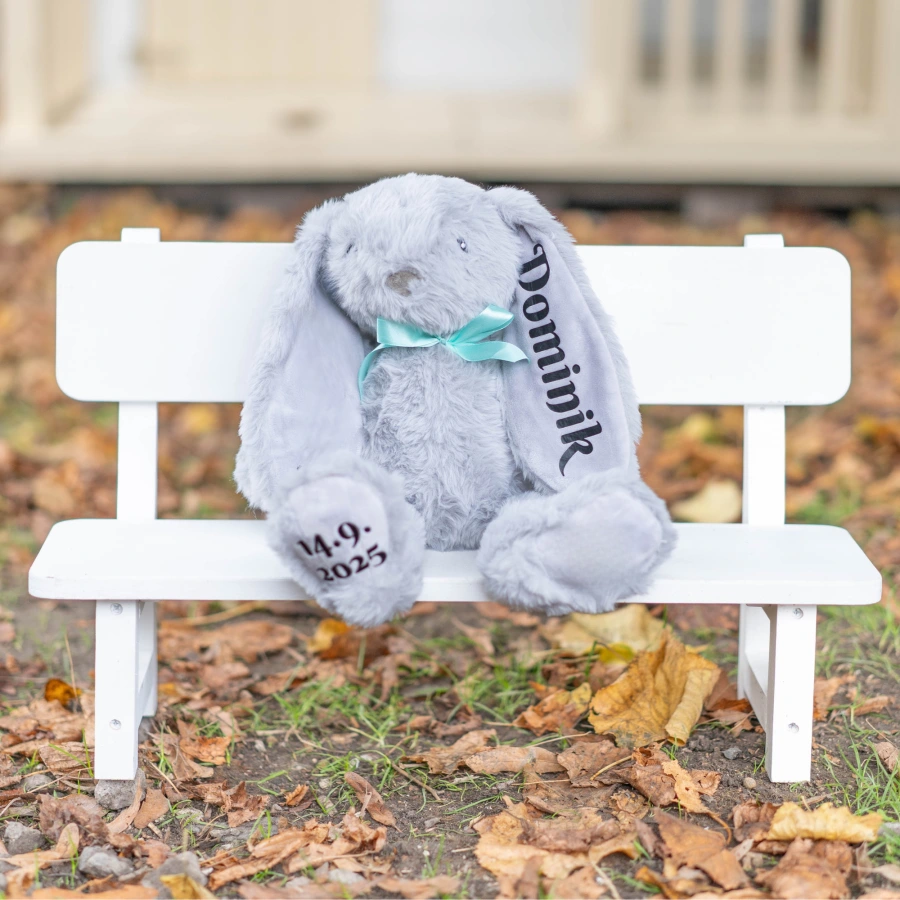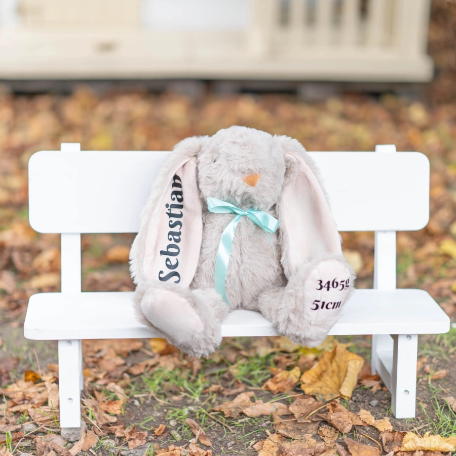 Měkoučký plyšový zajíček bude krásnou památkou na první roky vašeho miminka. Na ouško mu doplním jméno a na jednu tlapku krátký text, který si sami určíte. Může to být datum narození, váha, výška, malé věnování nebo symbol, který má pro vás význam.