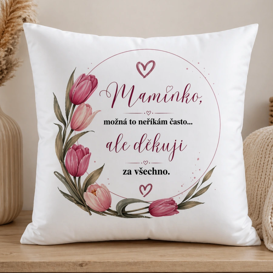 Dárkový polštářek pro maminku, který řekne to nejdůležitější za vás. Jemný květinový motiv s tulipány a krásný text z něj dělají milý a osobní dárek ke Dni matek, narozeninám, Vánocům nebo jen tak z lásky.