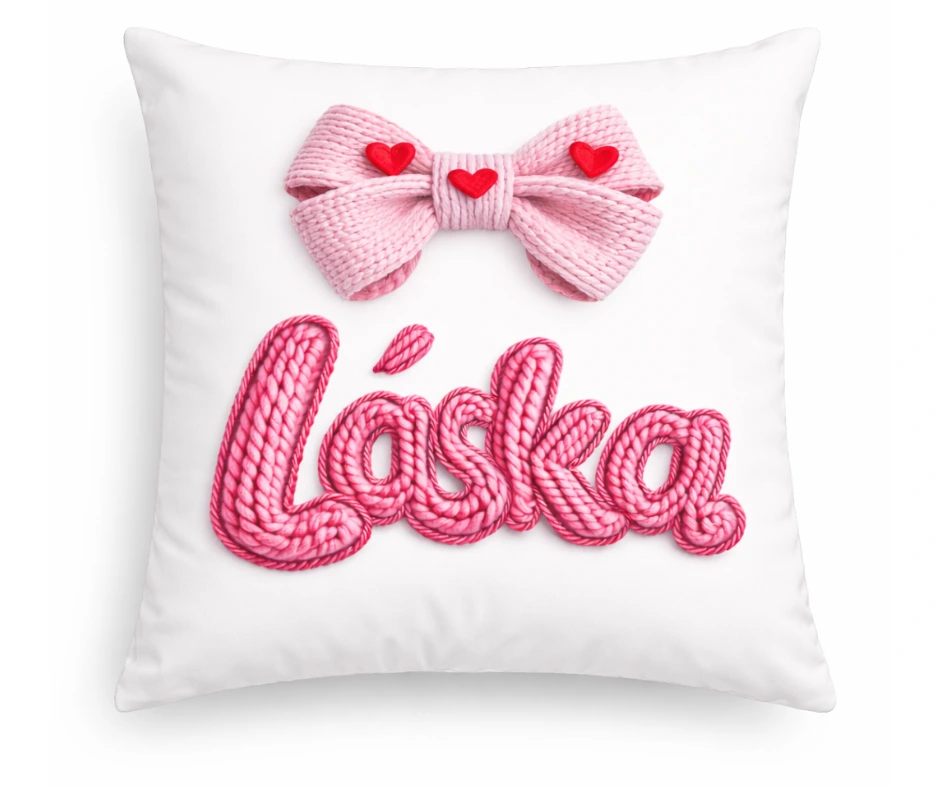 Jemný romantický motiv s nápisem Láska v růžovém 3D stylu doplňuje výrazná pletená mašle se srdíčky. Celý design působí měkce, něžně a zároveň výrazně.
