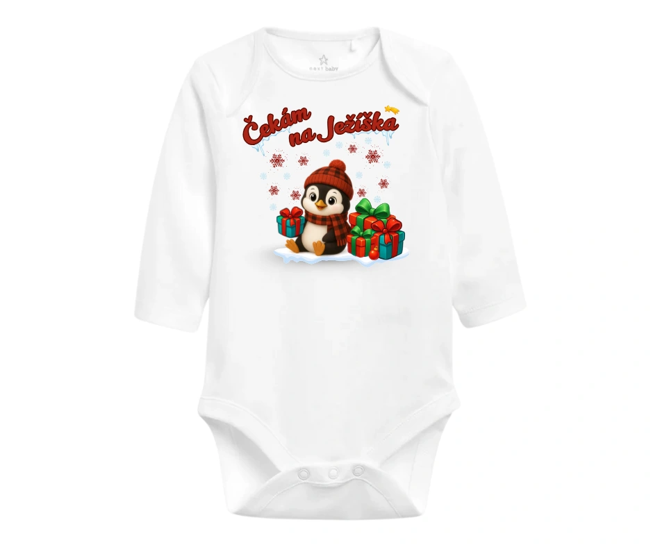 Veselé vánoční bodýčko s tučňáčkem zachycuje radostné čekání, hřejivou atmosféru a dětské těšení pod stromečkem.