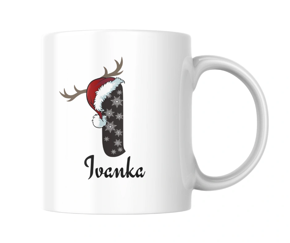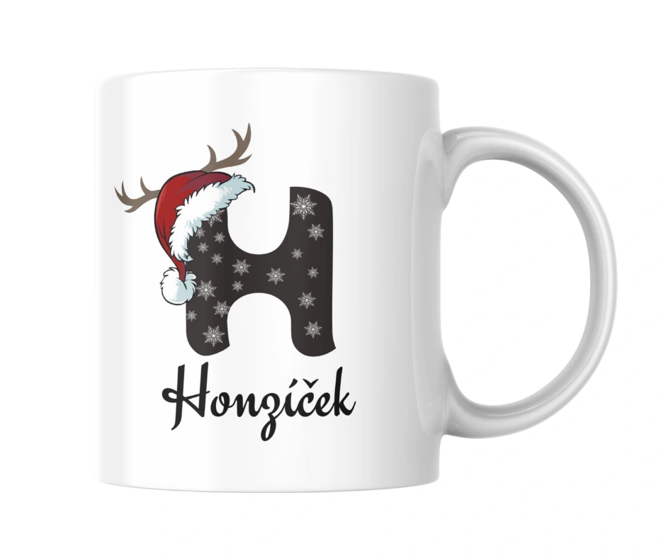 Každý hrnek zdobí velká iniciála s vločkami, parohy a vánoční čepičkou, doplněná o jméno dle vašeho přání.