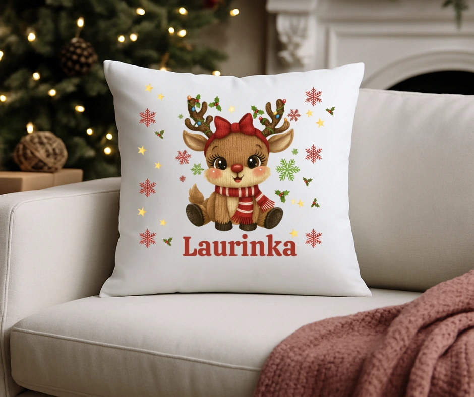 Kouzelný polštářek s holčičí verzí sobíka který tvoří nádherný vánoční motiv plný jemných detailů.