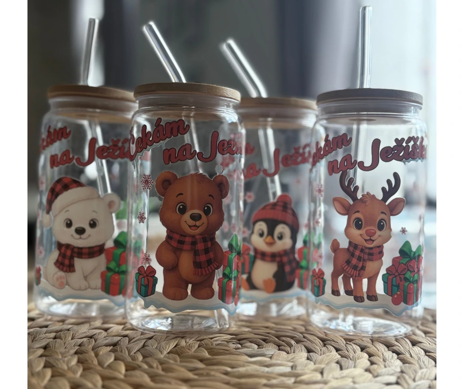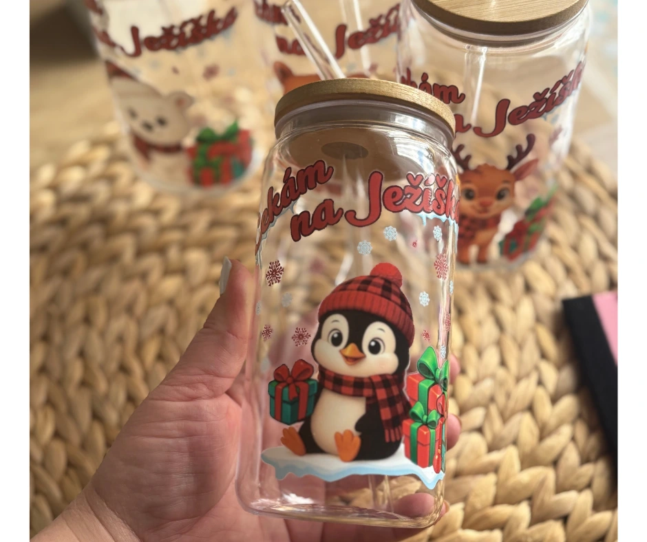 Vánoční sklenička s tučňákem a nápisem Čekám na Ježíška dodá každému doušku pořádnou dávku zimní nálady. Je ideální na džus, limonádu, smoothie nebo dětské kakao. Díky bambusovému víčku a brčku se nápoj nevylije a sklenička se pohodlně používá doma i na cestách.